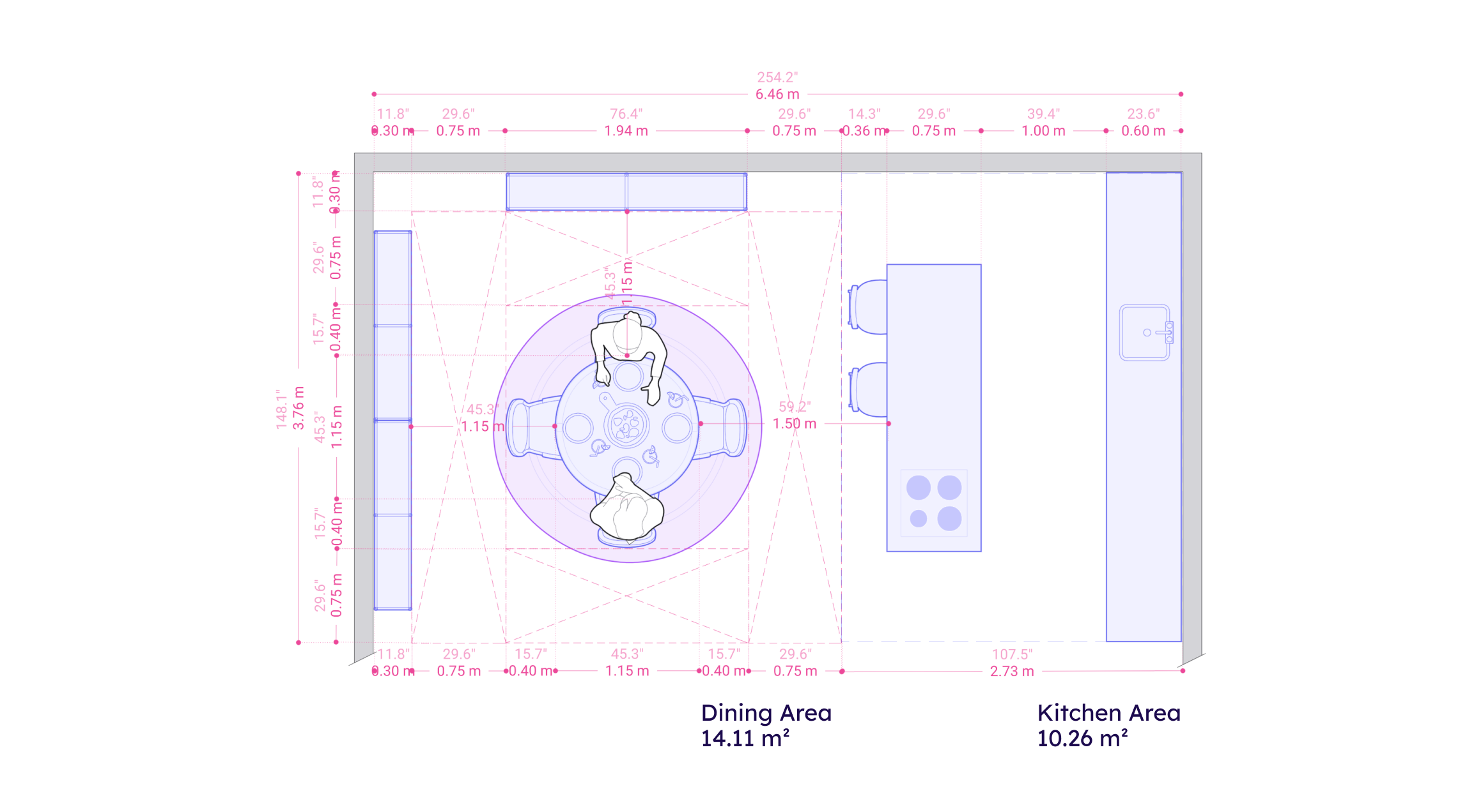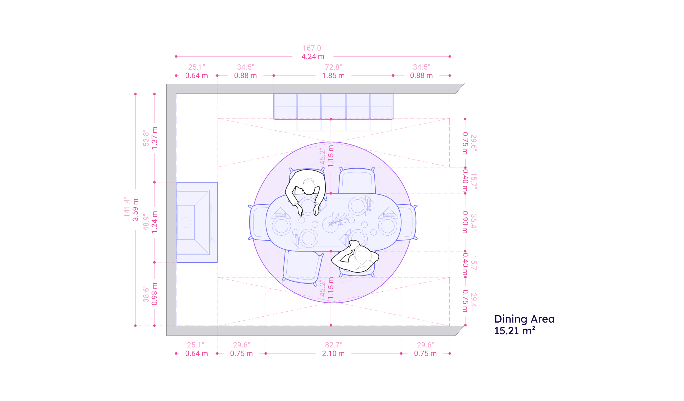 - Spacing & circulation between the dining table and furniture should be 75-90 cm / 29.5"-35.4".