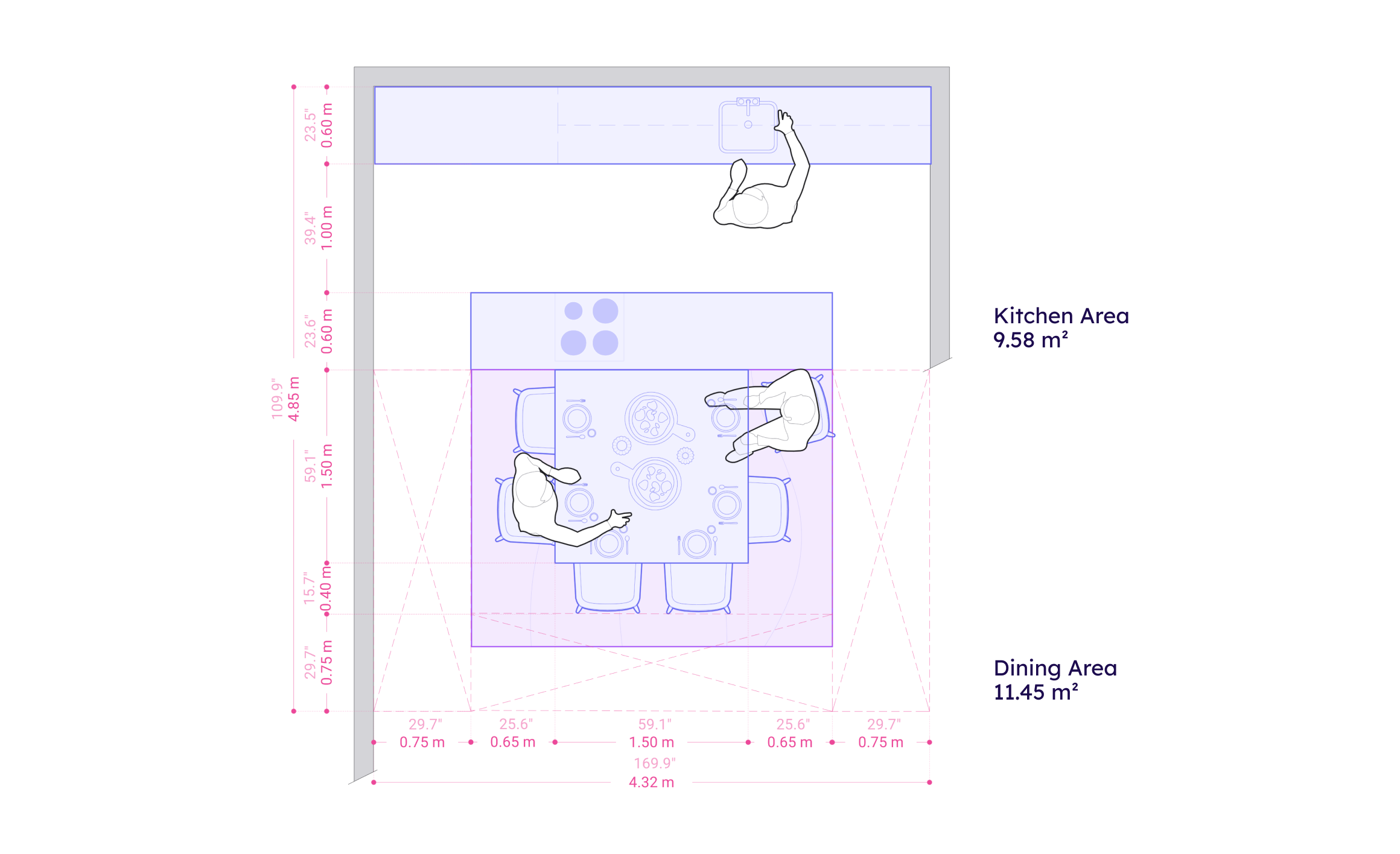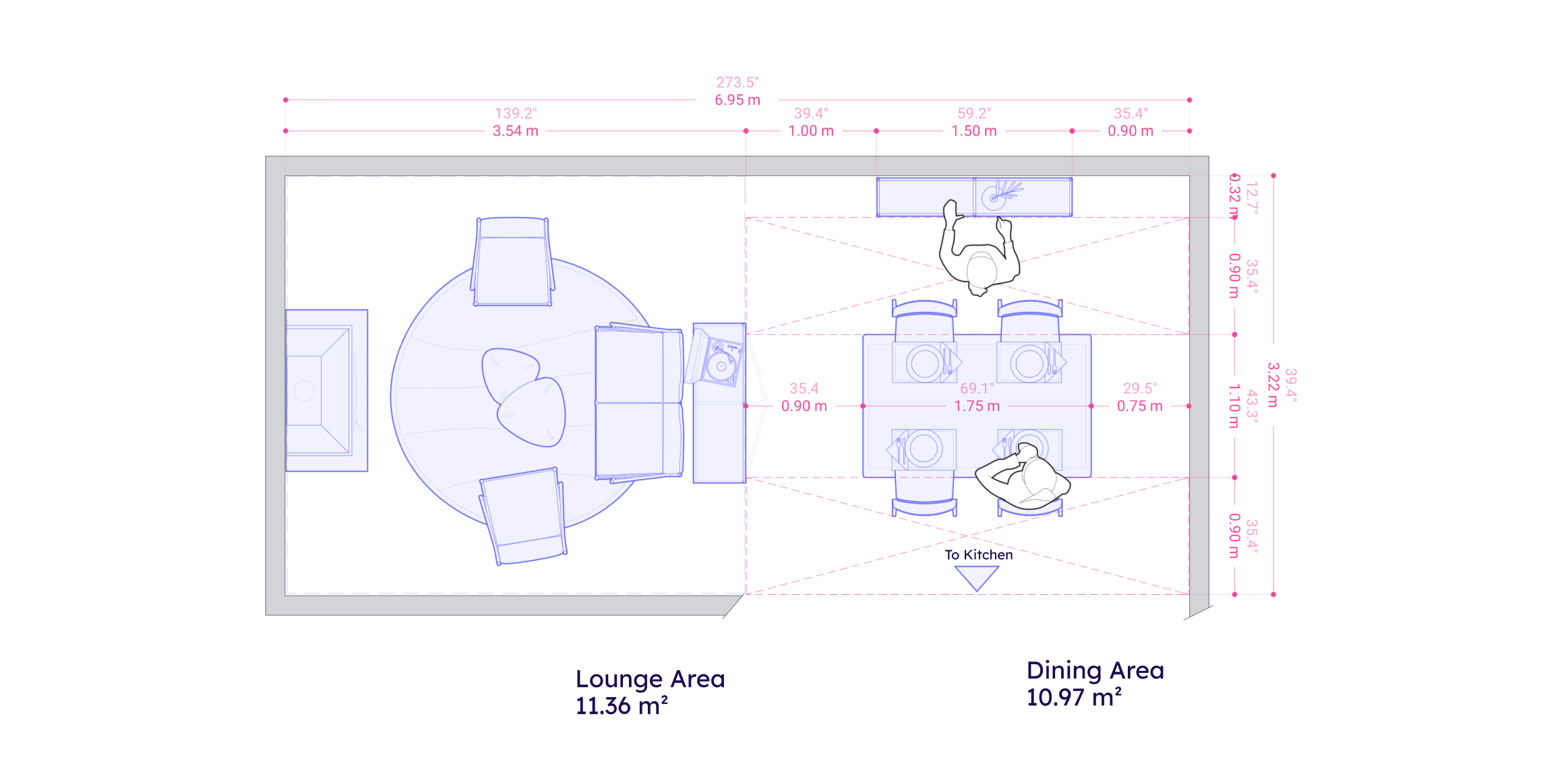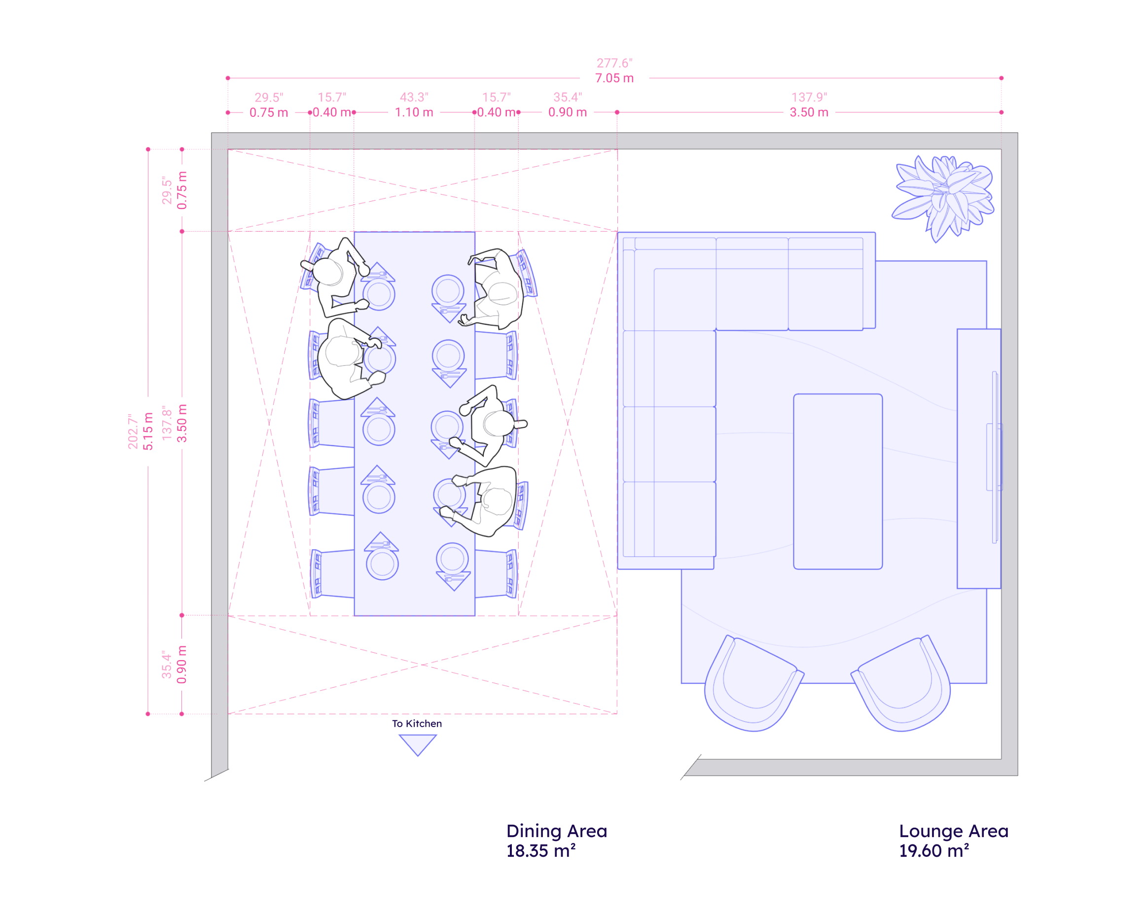 A spacious dining area for accommodating large gatherings within an open space can be achieved by grouping furniture into distinct zones. Some benchmark dimensions to keep in mind for this space typology are: